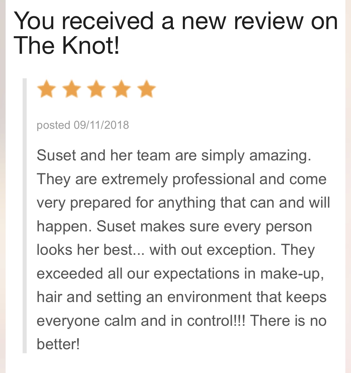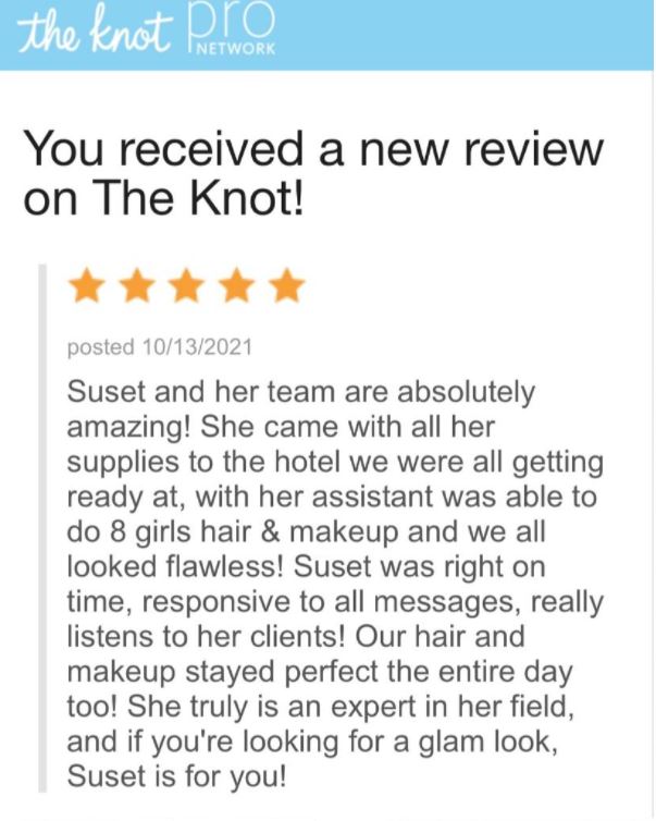 Suset and team were incredible, they did a fantastic job for my wedding!! The make up and hair truly exceed our expectations for me as the bride and the bridal party. She captured the essence of elegance, I was looking for my special day in July. I just got my wedding pictures back and we all look flawless, beautiful and stunning. I would highly recommend her she is a joy to work with and made me and my team bride look and feel great. We received so many complements on how beautiful we were, hair makeup all the details. She took the time during the pre planning to help me consider the whole look. She really made us all feel special. She and her team are super friendly and talented. Suset is a true professional, an artist, with an very impressive background and credentials. I was so happy she was able to be part of making my wedding day such a wonderful day! I would highly highly recommend her. From a Very Happy Bride - Maria!