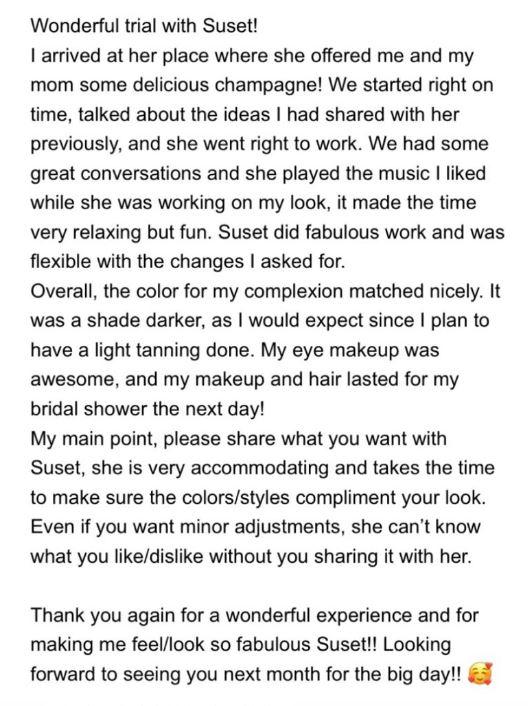 Suset did a BEYOND STUNNING hair and makeup trial for my wedding in November, and now I am even more excited for the big day! She transformed my look and I've never felt more like a princess. She is a wonderfully talented artist who truly works her magic. Suset also did a beautiful trial on my grandmother, and her team is doing my entire bridal party of almost 20 women! Also, the skin care she recommended for my face worked instantaneously, and hasn't been this clear in years. Thank you Suset!!